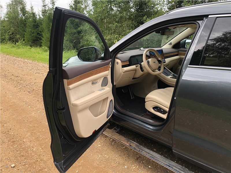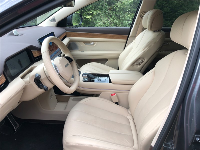 Дверь при открывании тяжелая, кстати, все они у M7 снабжены доводчиками, признак премиальности. Интерьер машины тоже выглядит дорого: отличного качества экокожа наппа, искусственная замша, мягкий пластик, имитация дерева с открытыми порами. Панорамная крыша со сдвижной передней секцией и солнцезащитной шторкой, которой, к слову, у некоторых дорогих «китайцев» нет. Удобные сиденья с подогревами, вентиляцией и массажем. Есть даже режим сна: экраны гаснут, динамики в подголовниках начинают синтезировать «белый шум», можно включить таймер будильника и вздремнуть в разложенном кресле.