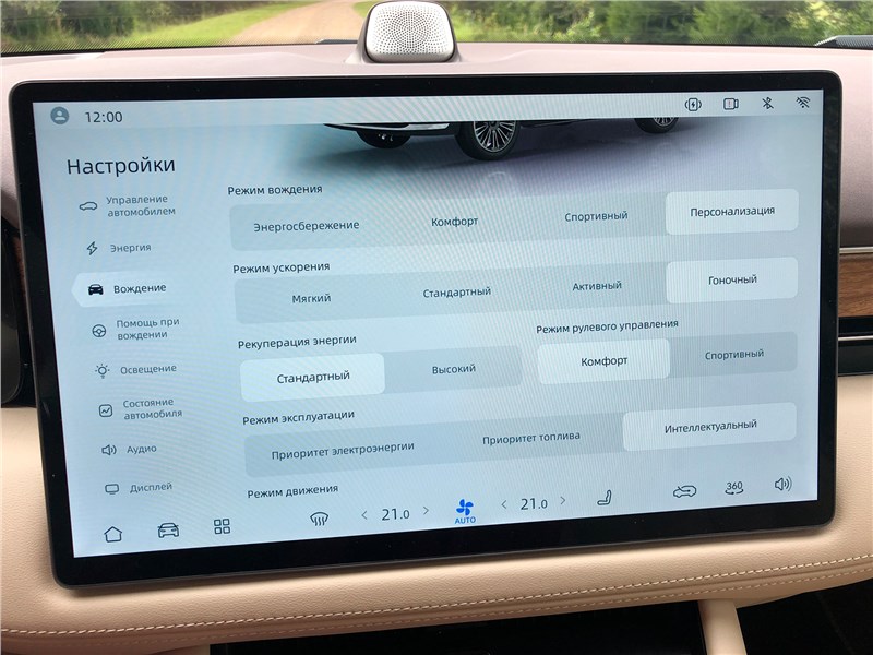 Сначала идем в центральный экран, настраиваем режимы движения, эксплуатации, вождения. Ну, допустим, пусть будет экономичный. Хотя можно включить и гоночный – и сразу же зарычал ДВС, причем на высоких оборотах: в гоночном режиме электромоторы выдают максимум крутящего момента и мощности, поэтому бензиновый двигатель работает по умолчанию. В электрическом режиме эксплуатации двигатель стихает, автомобиль бесшумно едет, расходуя только заряд батареи. Режим «приоритет топлива» – движение с преимущественно включенным ДВС, на бензине. В гибридном режиме автомобиль будет сам решать, когда подключать ДВС. Отдельная вкладка – режимы движения: стандартный, интеллектуальный, скользкая дорога. Пользуясь подсказками приборной панели, можно понять, что «интеллектуальный» – для движения по заснеженной дороге, а «скользкая дорога» – это грязь.